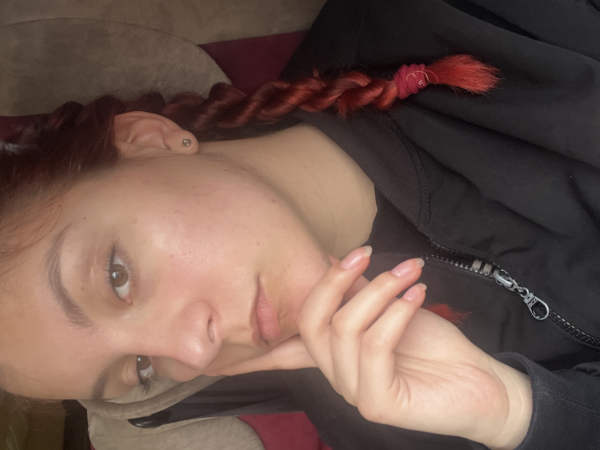 A woman with red braided hair lies in a prone position on a beige and burgundy-colored surface. She is wearing a black jacket with a visible silver zipper. The woman has fair skin and brown eyes. An earring is visible in her left ear. Her left hand is resting on her face. The location, Kalugerovo, Bulgaria, is not verifiable from the visual information.