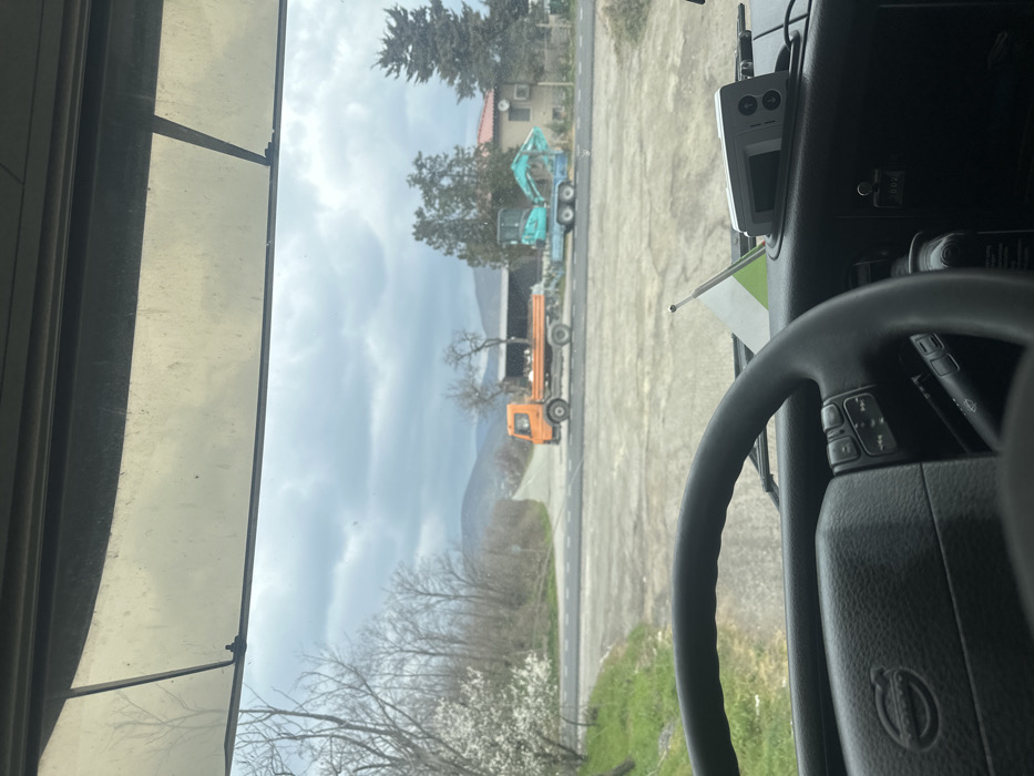 The image presents a view from the interior of a Volvo truck, parked on an unpaved surface adjacent to an asphalt road in Han Asparuhovo, Bulgaria