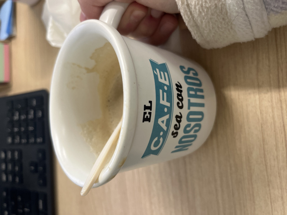 - "The image depicts a close-up, eye-level view of a white ceramic mug containing a light brown, foamy beverage, consistent with coffee" by FM-2bnDB3, licensed under CC BY 4.0