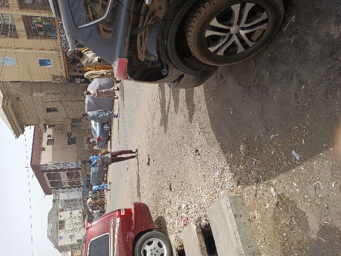 The image depicts a daytime street scene in Sabon Gari East, Nigeria. In the immediate foreground, a dark red SUV's rear quarter panel and wheel are visible on the left, parked on an uneven dirt and gravel surface. A black SUV's rear quarter and wheel are similarly positioned on the right. The ground in the foreground consists of dry, light brown soil, gravel, and scattered debris, including a concrete drainage structure on the lower left. In the midground, a male individual wearing a light blue polo shirt and dark trousers stands prominently on the unpaved street, facing slightly left. Numerous other individuals, primarily male and some in traditional attire, are observed walking or standing further down the thoroughfare. A light blue sedan is parked on the left side of the street, beyond the red SUV. A grey tarpaulin structure, possibly a makeshift stall, is visible on the right side of the street with a person nearby. The street itself appears to be a mix of worn asphalt and packed dirt. The background features multiple multi-story buildings lining the street. A prominent three-story building with a brown-red facade and lighter lower levels stands on the left. A tan or light brown multi-story building with visible shopfronts is on the right. Further buildings, some appearing residential, extend into the distance under a hazy sky. The overall scene suggests a busy urban environment with a mix of commercial and residential activity.