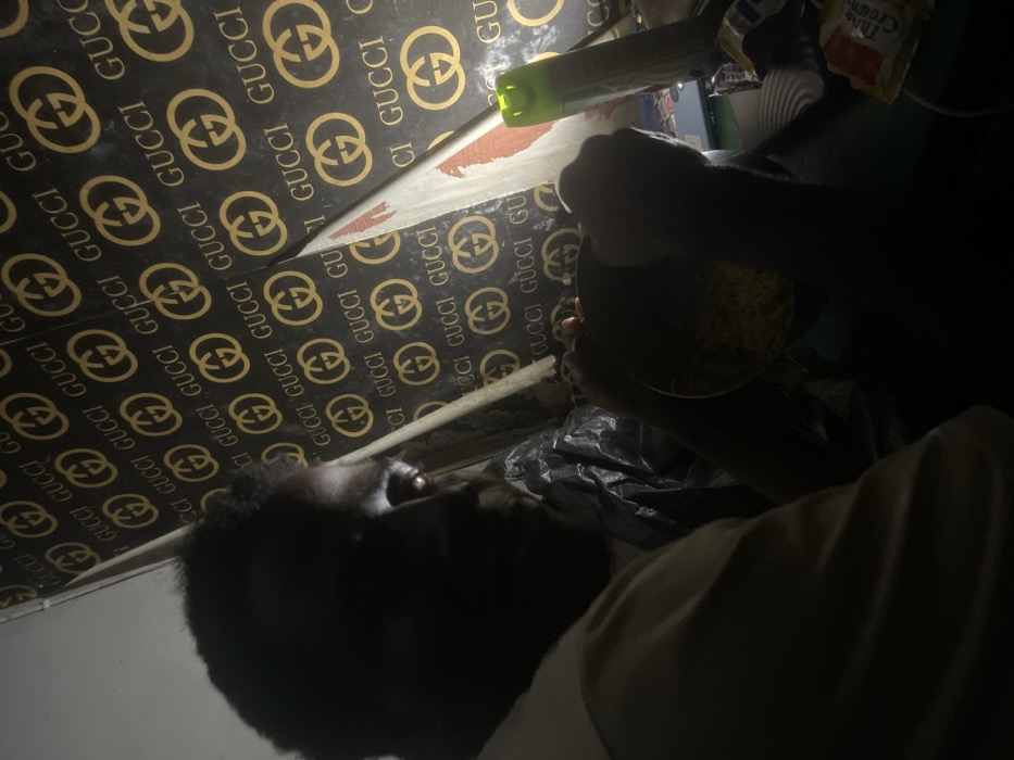 This image, captured in Uturu, Nigeria, depicts an indoor scene under low-light conditions. An adult individual with dark skin and short, dark, curly hair is visible from the chest up on the left side of the frame, largely in shadow, though their right eye reflects a light source. They are wearing a light-colored upper garment. The individual is holding a reflective metal bowl with both hands, containing light-colored, granular food, indicating the act of eating or preparing to eat. The background consists primarily of a wall covered in black wallpaper featuring a repeating pattern of gold "GUCCI" text and interlocking "GG" logos. This wallpaper exhibits signs of wear, including tears and peeling, particularly near the center. A vertical, light-colored wooden or plastic beam is positioned against this wall, partially obscuring the wallpaper. To the right of the frame, on a dark, flat surface (likely a table or counter), a fluorescent green and white cylindrical object, resembling a spray can, stands upright. Adjacent to it are a small, rectangular package with "Three Crown" branding, a bunched black plastic bag, and other indistinct items. A reflective surface, possibly a screen, is also visible amongst these objects.