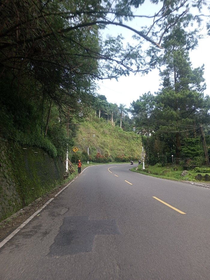 A winding asphalt road with yellow dividing lines cuts through a lush landscape. A moss-covered stone wall lines the left side, while a grassy hillside rises to the right. Tall trees and vegetation overhang the road, creating a canopy effect. A road worker in orange stands near a yellow warning sign. Motorbikes are seen further down the road. The sky is visible through gaps in the trees, suggesting a partly cloudy day.