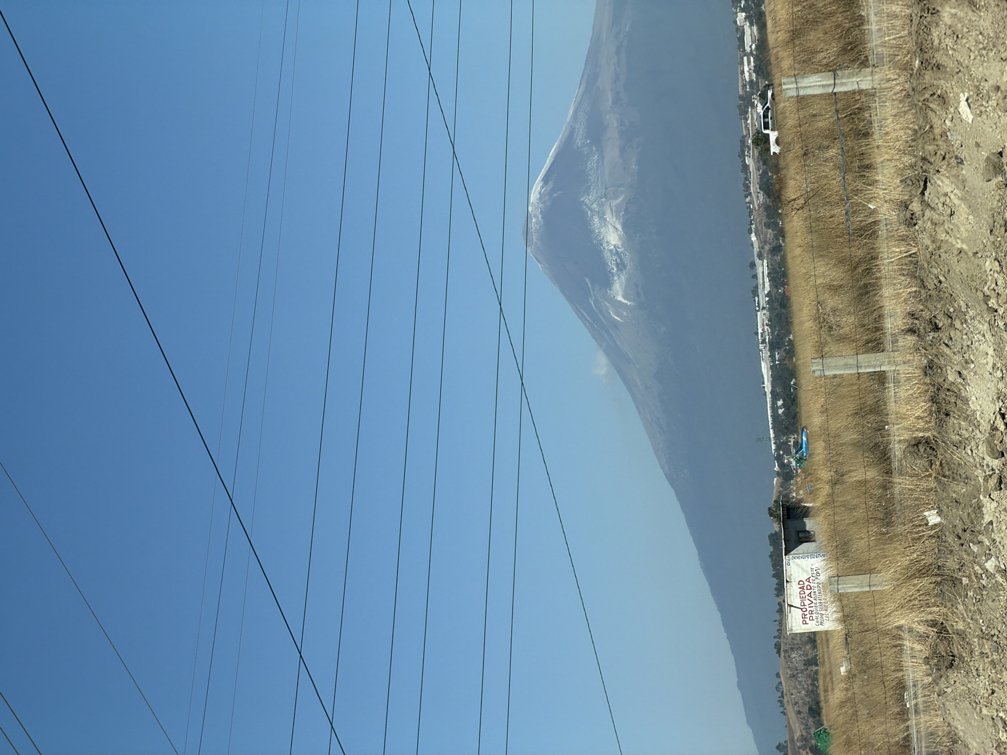 The scene depicts an outdoor landscape in San Andrés Cholula, Mexico. The upper frame features a clear, bright blue sky traversed by multiple dark, taut electrical power lines running horizontally and diagonally. Dominating the background is the Popocatépetl volcano, its conical peak covered in a cap of white snow and ice, with darker, rocky slopes extending downwards, gradually fading into the distant, hazy landscape. The mid-ground consists of an expansive, dry field filled with golden-brown, desiccated grasses. Within this field, towards the left-center, a small, rectangular, light-colored structure, possibly a shack or temporary shelter, stands. Red lettering, including "PROPIEDAD PRIVADA" (Private Property), is painted on its visible side. A multi-strand wire fence with light-gray concrete posts runs horizontally across the lower-mid-ground, segmenting the field. Beyond this fence, deeper into the field and further to the right, a white pickup truck is partially visible. In the distance, between the field and the base of the volcano, scattered buildings and vegetation indicate a developed area. The immediate foreground comprises disturbed, dry soil and loose dirt, suggesting an unpaved edge or construction activity. No individuals, overt actions, or direct interactions are visible within the frame.