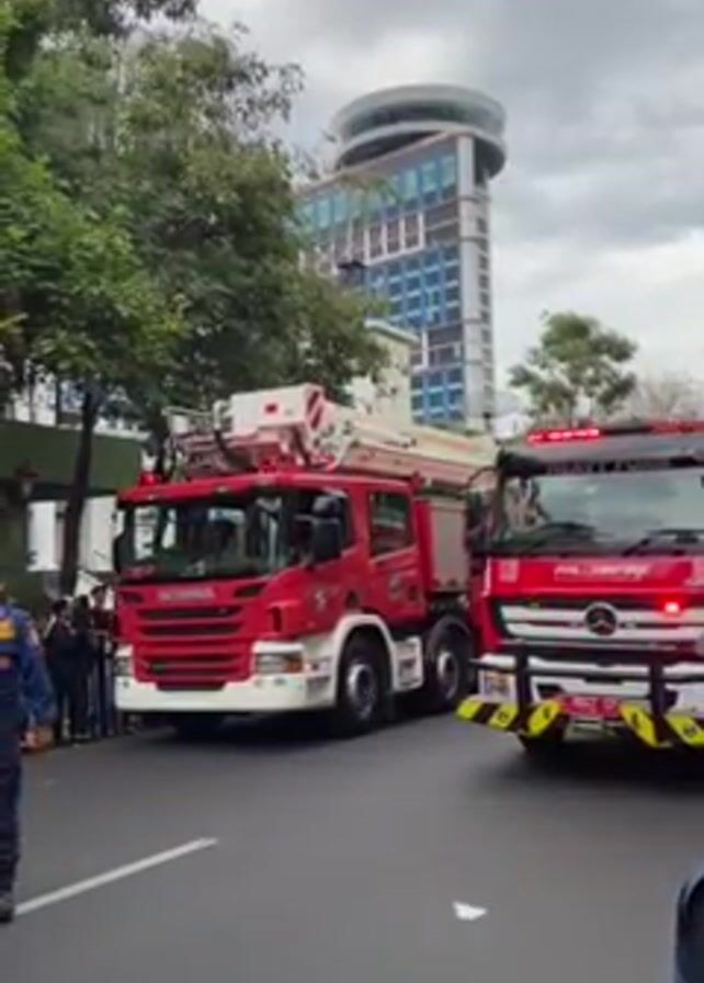 A street with two fire trucks stopped on the road. The fire truck on the left is red and white and says SCANIA on the front. It has a tall ladder on top. The fire truck on the right is red with a black bumper and says HEAVY FOAM and FALCONFIRE on the front. Their emergency lights are flashing. People are standing on the side of the road. A tall, modern building is visible in the background. There are trees on the side of the road and the sky is overcast.