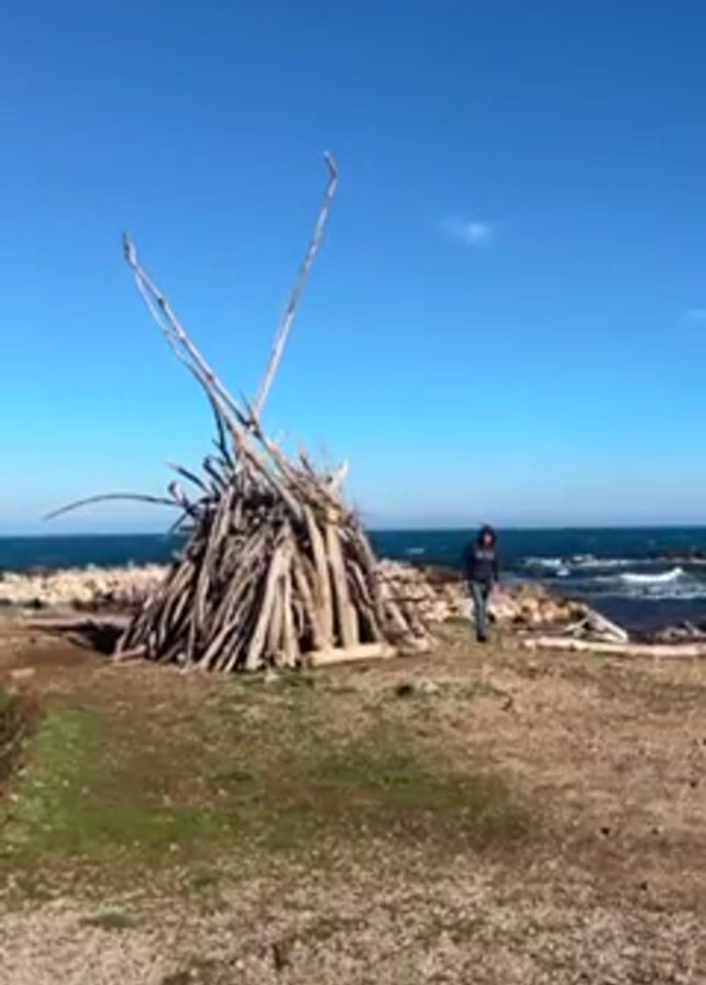 person standing near a large pile of driftwood on a rocky coastline. The person is wearing dark clothing. The driftwood is stacked in a conical shape, with some pieces extending upwards. The sea is visible in the background, and the sky is blue. The ground is a mixture of dirt, grass, and rocks.