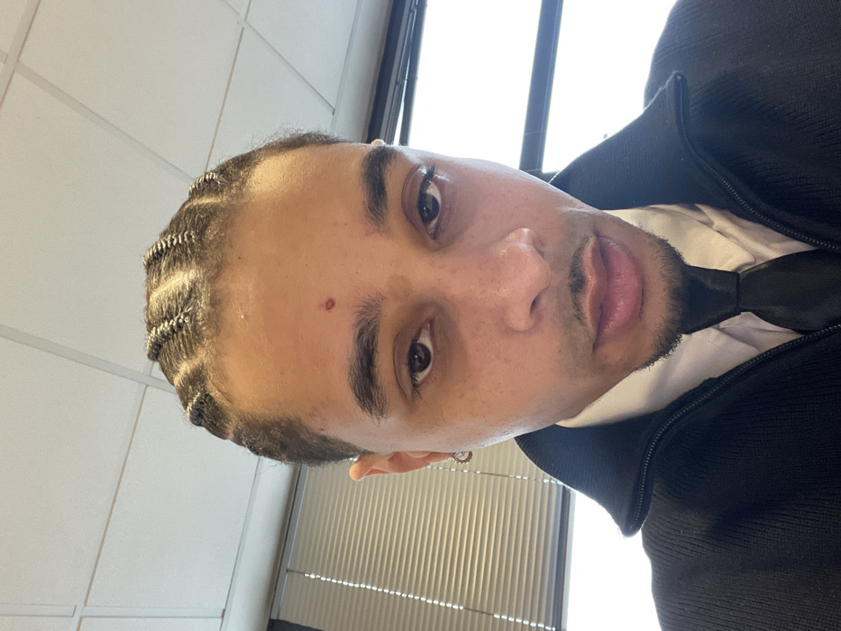 A person with braided hair and light skin. They are wearing a black blazer, a white shirt, and a black tie. The person has a small mark on their forehead. Their ear is visible, showing a ring. The person is looking directly at the camera. The background consists of a window with blinds and part of a white ceiling. The photo appears to be taken at an upward angle.