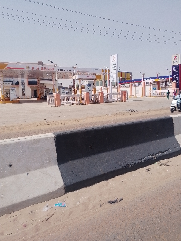 The image displays an exterior scene in Chiranchi, Nigeria, under a clear, pale blue sky. In the immediate foreground, a concrete road median barrier is visible, painted white on its upper section and black on its lower half. Directly in front of the barrier lies a sandy dirt shoulder with scattered debris, including a blue plastic wrapper. The midground transitions into a paved area leading to a large commercial complex. On the right side of this paved area, two individuals are seen riding a white scooter-style motorcycle. Further into the complex, a solitary individual in dark clothing is observed walking near a perimeter fence. The background is occupied by two adjacent fuel stations. The station on the left is identified by overhead signage as "B.A. BELLO NIGERIA LIMITED" and features multiple fuel pumps under a white canopy with yellow/gold accents. A building with a dark roof and light-colored walls stands behind the pumps, displaying a "DIESEL" sign. The station on the right, indicated by prominent vertical signage, bears the "SALBAS" brand and also presents fuel pumps beneath a canopy. This "SALBAS" sign lists "DIESEL," "PMS," "Kerosene," "LPG," and "Lubricant" as available products. White and pink/peach-colored fencing and bollards delineate the boundaries and entrances of both fuel stations. Multiple thin power lines are visible stretching across the upper portion of the frame. The ground throughout the scene appears generally dry and dusty.