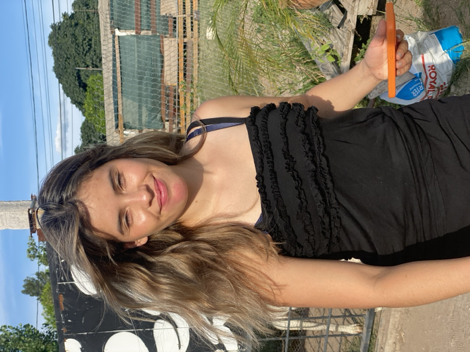 A woman with sun-kissed skin and long blonde hair smiles slightly. She's wearing a black ruffled top with thin straps, against a backdrop of greenery and a wire fence. One hand holds an orange object, and a bag with the word "Royal" is visible. The scene is brightly lit with natural sunlight, giving a warm and cheerful feel. The image is angled on its side.