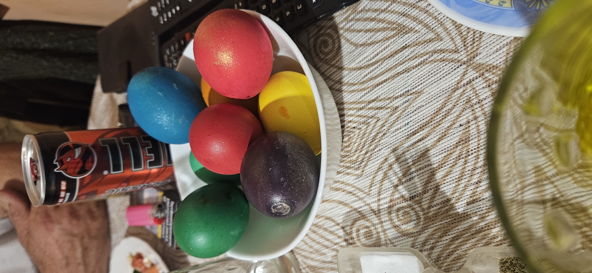 tilted view of a table setting, likely indoors. A white bowl contains several dyed Easter eggs in various colors: red, blue, yellow, dark purple, and green. A red and black can of Hell energy drink is beside the bowl. A portion of a computer keyboard is visible in the background, along with a beige table cloth. A plate with a blue pattern is slightly visible, as is a blurred glass object. The location is unknown and there is no evidence that the location is Nova Zagora, Bulgaria. No people are clearly visible in the image, though a portion of an arm and hand are at the edge of the image.