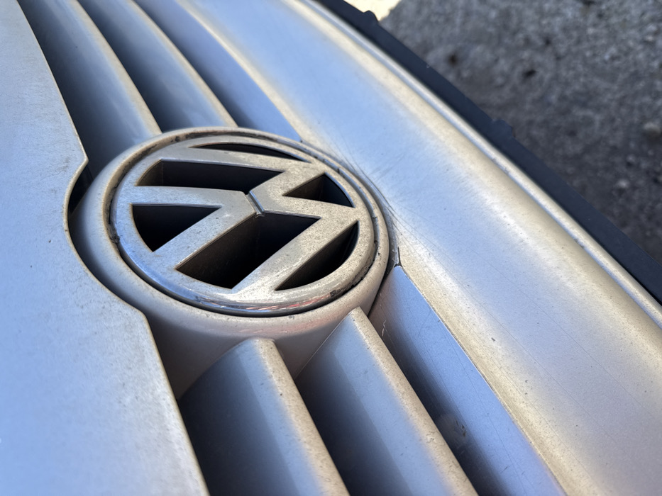 - "The image displays a close-up, low-angle view of the front grille and lower bumper section of a light silver or grey Volkswagen vehicle, observed outdoors under direct sunlight" by FM-jLMbw2, licensed under CC BY 4.0