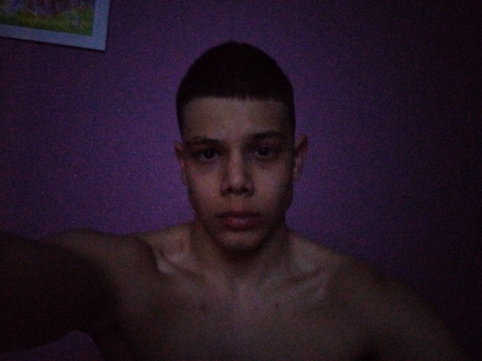 An indoor photograph, located in the city of Troyan, Bulgaria, depicts a single male individual. The subject, appearing young, is shown from the chest up, bare-chested, with prominent clavicles. He has short, dark hair styled with a faded cut on the sides and a short, blunt fringe across the forehead. His face is directed forward, with dark eyes gazing directly into the camera. His expression is neutral. The background consists of a solid purple wall. In the upper left corner, a portion of a rectangular, framed object, possibly a picture with indistinct colorful content, is visible. The scene is dimly lit, contributing to a slightly grainy image quality.