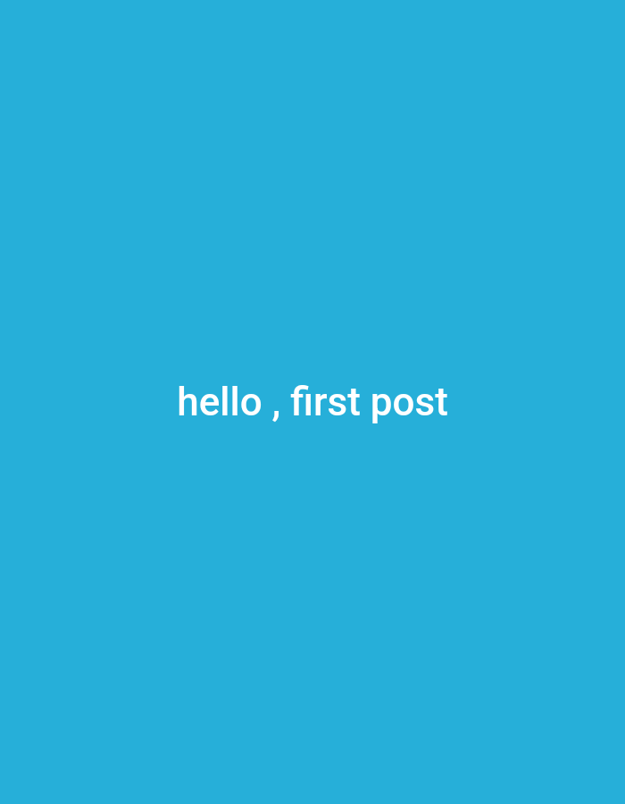 The image depicts a solid blue background with the text "hello, first post" in white