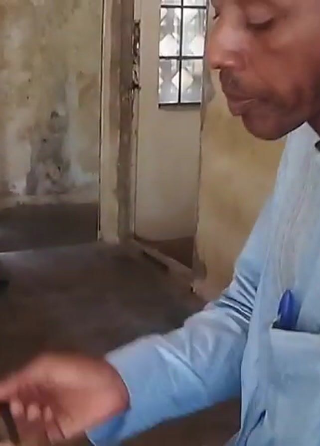 Here is a brief description of the video. The video shows several men in a room. One man in a light blue outfit is eating something from a tray. Another man in a green outfit and patterned hat looks down, and a man in a white outfit sits in the background. Two water bottles are visible on the table in front of the man in the light blue outfit. The room looks relatively simple and undecorated, with pale-colored walls.