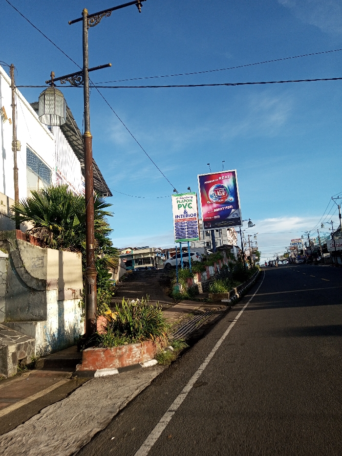 The image depicts an urban street scene in Khouathineung, Laos, under a clear, bright blue sky with minimal scattered clouds. In the foreground on the left, a concrete sidewalk runs alongside an elevated structure featuring a white building with visible windows and a sloped roof. A dark, ornate lamppost with a glass lantern on its lower arm and two additional horizontal arms at the top stands prominently on the sidewalk, positioned between lush green foliage planted on an earthen bank with a concrete retaining wall, and a low, reddish-brown planter box with white curbing. Further along the sidewalk, a metal grate is visible. To the right, an asphalt road occupies the midground, with a solid white line delineating its edge from the sidewalk area. In the distance along the road, multiple structures and vehicles are visible, including several parked cars and what appears to be a motorcycle. A secondary, unpaved road or access path slopes uphill to the left, intersecting the main road and leading to additional buildings. Overhead, utility wires crisscross the sky. Two prominent billboards are erected further down the road; the left one is blue with white text, reading "Gedung PLAPON PVC & INTERIOR," while the larger billboard to its right displays "PREMIUM REAL" at the top and features a product called "KOLASE BLUETEQ DUO BERRY FEEL" with a circular blue and red graphic. No people are discernible in the immediate foreground, and distant figures on the road are indistinct. The environment appears to be an active but not heavily trafficked street.