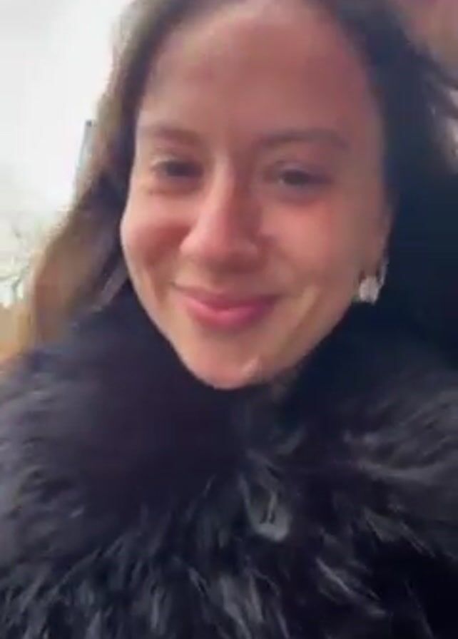 A woman with brown hair is walking outside, smiling at the camera. She is wearing a black fur coat with a button closure. The background is slightly blurred, but trees and a sign are visible. The weather appears overcast.