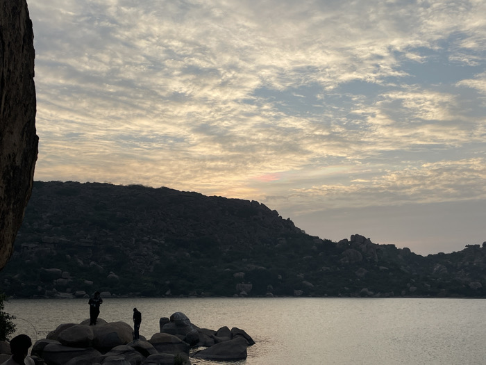 The scene depicts a natural landscape at Sanapur Lake in Sanapur, India, during either dawn or dusk. A calm body of water, likely a lake, occupies the foreground and middle ground, reflecting soft light. Several large, rounded grey boulders protrude from the water in the immediate foreground. A dark, rocky hill range, sparsely covered with vegetation, spans the mid-ground, silhouetted against the sky. A large, dark rock face partially frames the left side of the image. The sky is largely covered by altocumulus clouds, displaying light blue-grey tones with soft yellow and faint orange hues near the horizon. A small, distinct patch of pinkish-red light is visible above the distant hills on the left, indicating the sun's position. Three individuals are present: two are clearly visible as dark silhouettes standing on separate boulders in the foreground. One stands upright, facing generally right, while the other is slightly hunched over, also facing right. The head and shoulders of a third individual are partially visible and heavily cropped in the bottom-left corner, silhouetted against the water. The individuals are positioned on the rocks overlooking the water.