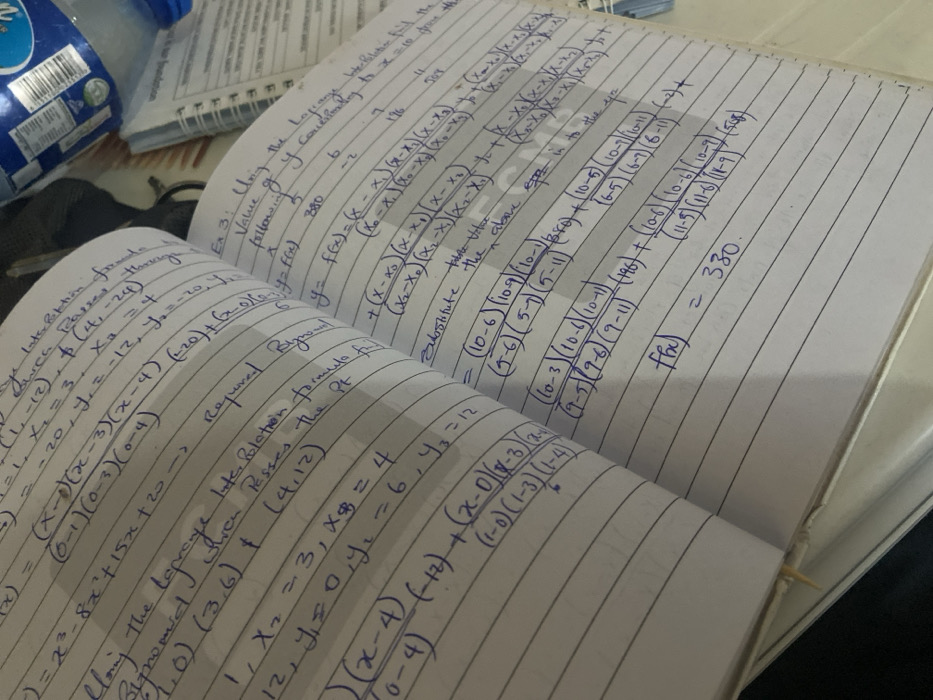 This image displays an open, lined exercise book filled with handwritten mathematical equations in blue ink, centered on a light-colored surface, likely a desk or table. The text visible on the left page references "Lagrange Interpolation formula" and includes algebraic expressions with terms like "(x-0)(x-3)(x-4)". The right page continues with more complex calculations involving fractions and numerical values, demonstrating the application of the Lagrange Interpolation method, culminating in the expression "f(x) = 330". A partially visible plastic water bottle with a blue cap and a white spiral-bound notebook are present in the upper right background. No individuals are visible, and no actions are depicted beyond the static arrangement of study materials. The image does not contain any visual information to confirm the specific location within the city of Jos, Nigeria.