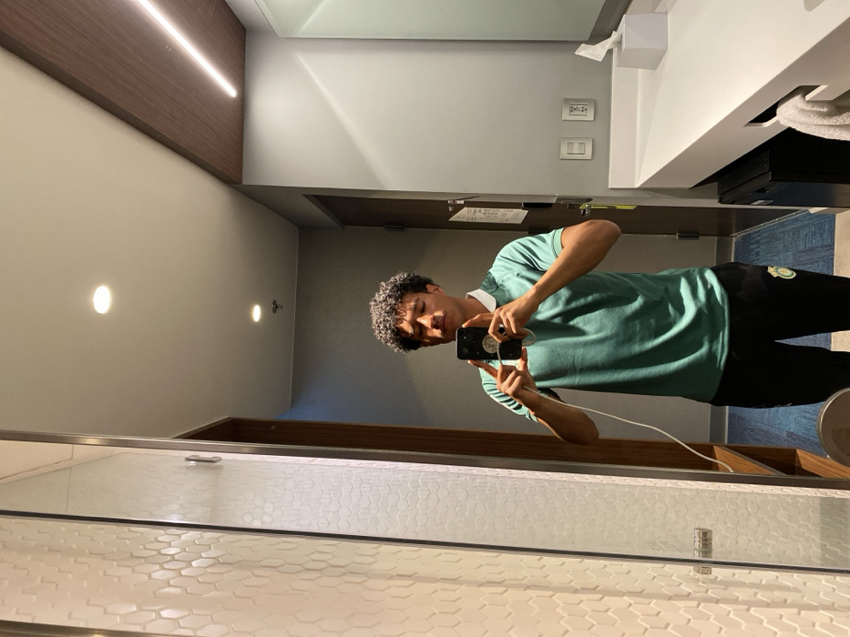 A person with curly hair holds a phone in a bathroom mirror, capturing a selfie. The individual wears a green t-shirt, a white collar, and black pants with a logo. The bathroom features white walls, recessed lighting, and a horizontal light fixture. The mirror reflects a tiled shower, while the background shows a glimpse of a blue carpet. A tissue box and light switches are visible above the sink.