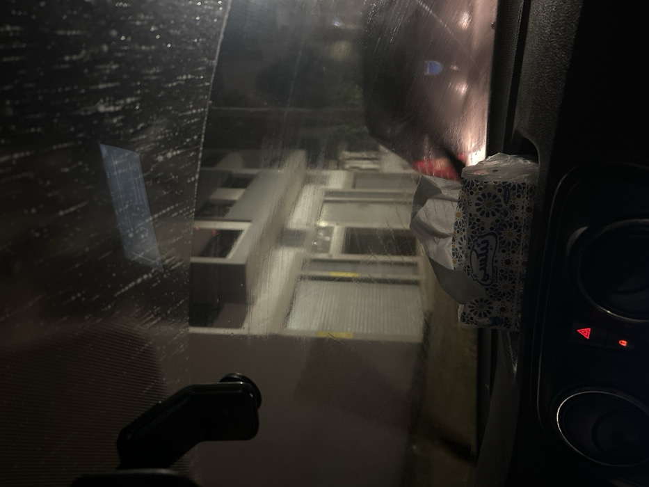 View through a car windshield on a dark night. Water droplets obscure some areas of the glass. A multi-story building with illuminated windows is visible. A tissue box is on the right of the windshield. The car's dashboard, including hazard light button and round dials, are also visible. A phone mount sits at the bottom of the frame.