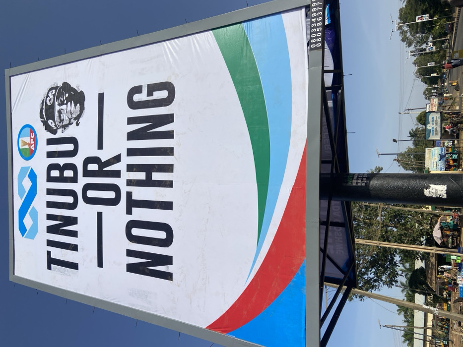 A large, vertical billboard displays "TINUBU - OR - NOTHING" in bold black lettering