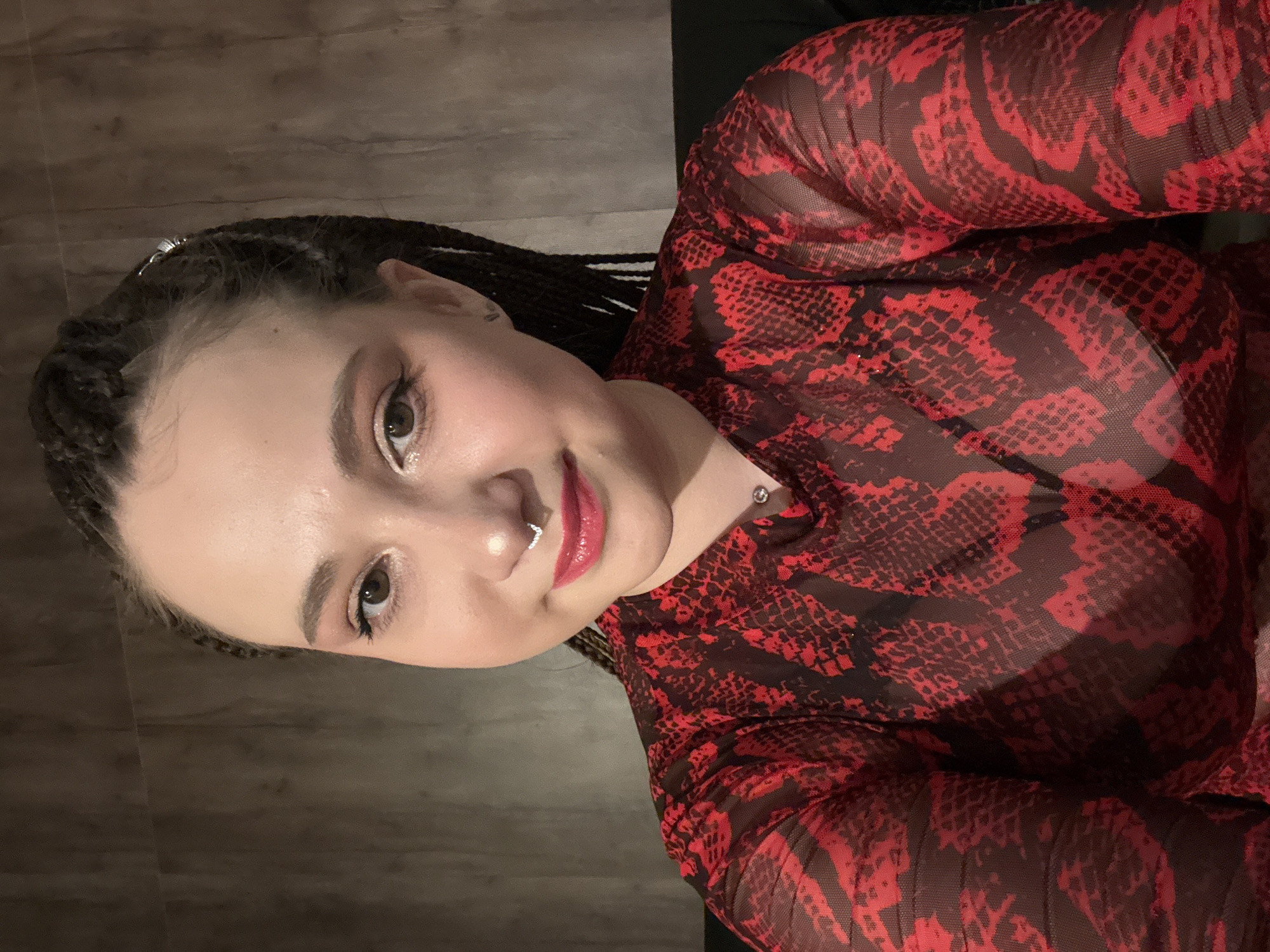 A fair-skinned young woman with braided hair and a nose ring poses in a red and black snake-print top