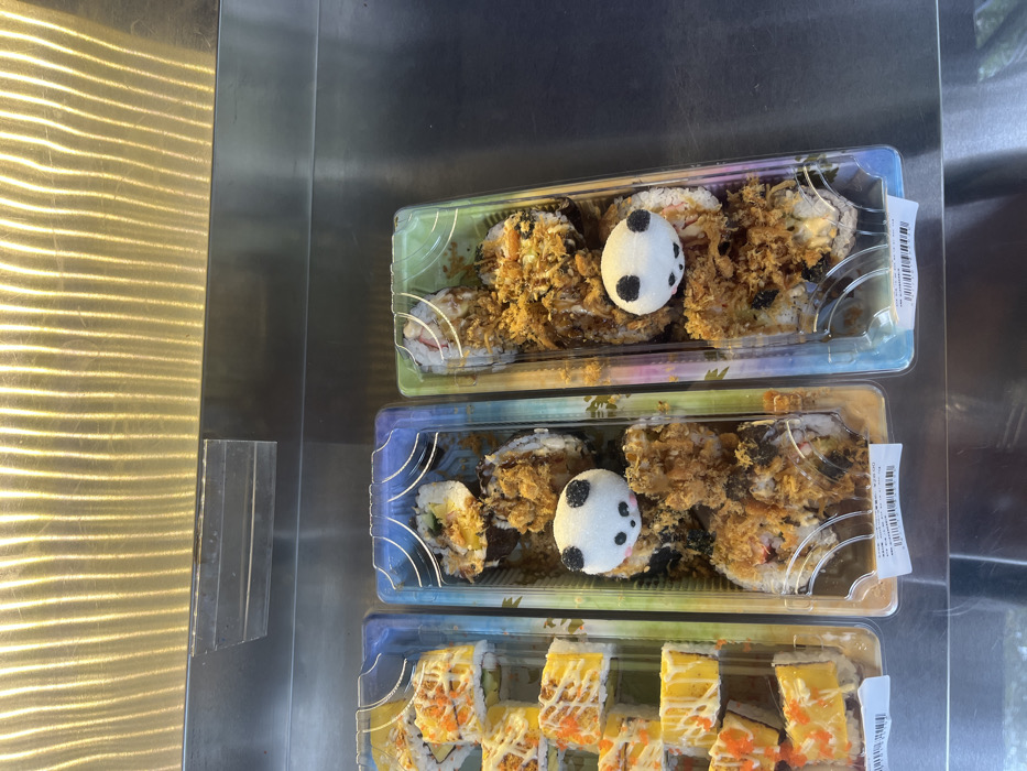 - "The image displays a close-up view of three transparent plastic food containers, each holding pre-packaged sushi rolls, situated within a metallic, reflective display case" by FM-VYYYD2, licensed under CC BY 4.0