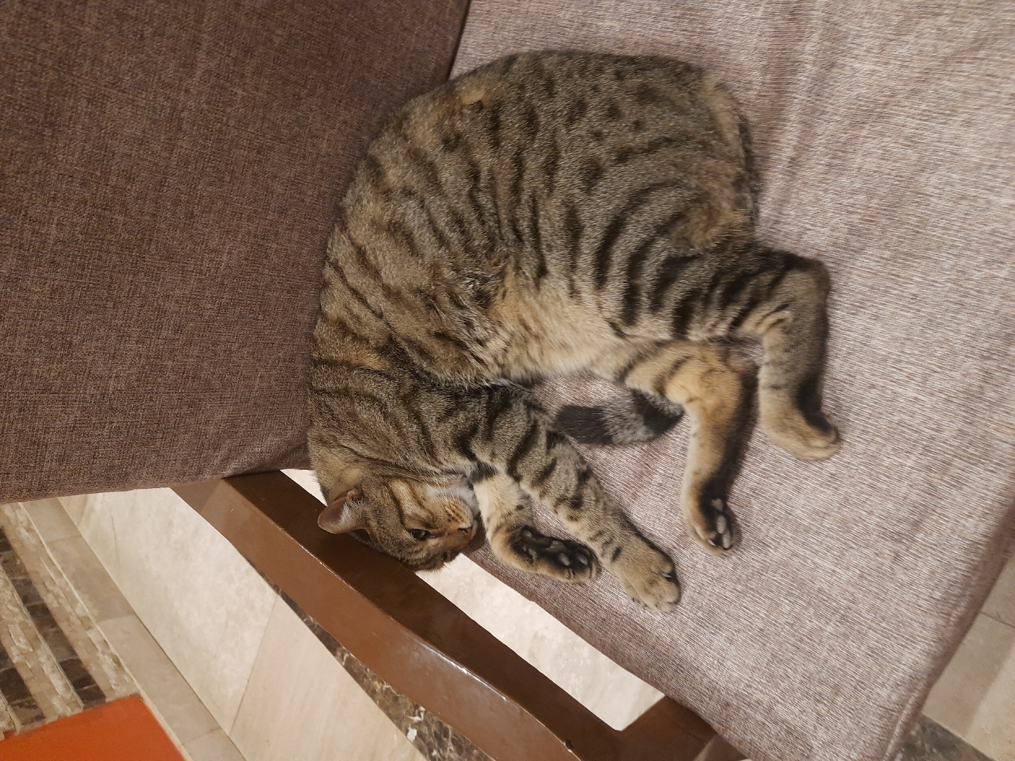 A tabby cat is curled up on a brown, upholstered chair. The cat is positioned near the edge of the seat, with its head hanging slightly over the side. The chair has a wooden frame. The background includes a tiled floor and a section of a brown cushion. There is no visual information to confirm the location is Hurghada, Egypt.