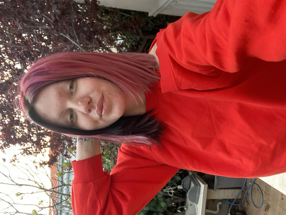 A female individual is depicted in a close-up, waist-up selfie portrait, positioned outdoors in what appears to be a residential backyard in Kunje, Montenegro. The subject has shoulder-length, straight hair, dark on the viewer's left side and magenta/pink on the viewer's right side, with dark roots visible at the part. She has a light complexion, light-colored eyes, and light eyebrows, with minor skin blemishes visible on her forehead, nose, and chin. A subtle smile is present with closed lips. She is wearing a bright red long-sleeved sweatshirt, with the collar pulled down exposing her right shoulder. Her left arm is raised, with her hand resting behind her head/neck, revealing a small, dark-colored tattoo on her inner left forearm/wrist area. The background on the viewer's left features sparse tree branches with small green leaves against a bright, possibly evening, sky and a distant light-colored building with a reddish roofline. Below this, an outdoor utility area includes a light-colored sink counter with a faucet, a dark basin, a gray object resembling a grill lid or cover, a blue hose coiled on the ground, and a dark gray waste bin partially visible beneath the counter. On the viewer's right, dense foliage with dark reddish-purple leaves is visible, along with a white vertical structure, possibly a pillar or railing.