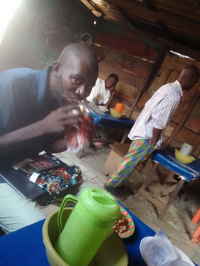 An informal interior scene depicts three adult males within a rustic structure. The walls are constructed from unpainted wooden planks, and the ceiling appears to be corrugated metal. Natural light enters from the left, creating a bright glare. In the foreground, a bald, bearded male in a dark blue polo shirt looks directly at the camera while drinking from a clear plastic sachet containing a red liquid. A laptop and a floral-patterned cloth object are on the blue-covered table before him. On the same table, a large light-green plastic jug rests inside a yellowish-beige plastic basin, accompanied by a small plate holding a snack and a white plastic bag. In the midground center, a male in a white t-shirt is seated at another blue-covered table, his hand near his face, looking towards the right. A yellow plastic bowl and an orange plastic cup are on his table. To the midground right, a third male stands or leans, facing away from the camera. He wears a striped long-sleeve shirt and brightly patterned trousers featuring green, blue, and pink square designs. A blue-covered table with a yellow plastic bowl and a white cup is adjacent to him. Simple wooden stools are visible beneath the tables. The location is an unknown establishment within Unknown, Unknown.