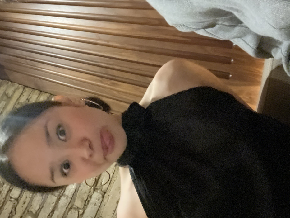 The scene is an interior shot, likely within a casual establishment in Toronto, Canada, such as a restaurant, bar, or private residence. The primary subject is a female with dark hair pulled back, wearing large gold hoop earrings and a black halter-neck top. She faces the camera directly, making a playful expression with wide eyes and her tongue slightly extended over her lower lip. To her lower right, a second individual is partially visible, showing a shoulder and arm clothed in a light grey, textured garment. The background features two distinct wall textures: to the left, a wall of irregularly shaped, light-toned stone or rough-hewn brick, and to the right, a wall composed of vertical, medium-brown wooden slats or paneling. The lighting is ambient and somewhat subdued.