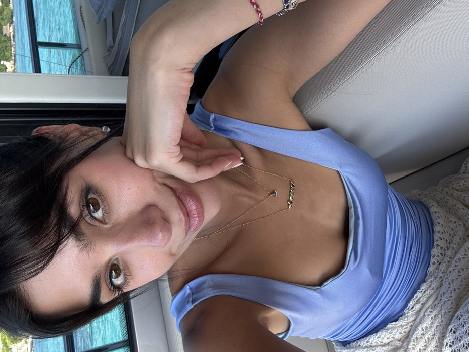 A young woman poses indoors, bathed in soft light. She wears a light blue tank top and a crocheted white wrap. Two delicate gold necklaces adorn her neck. Her dark hair is pulled back, revealing an earring. She rests her cheek on her hand, looking at the camera with warm brown eyes. A window frames a bright blue ocean view behind her.