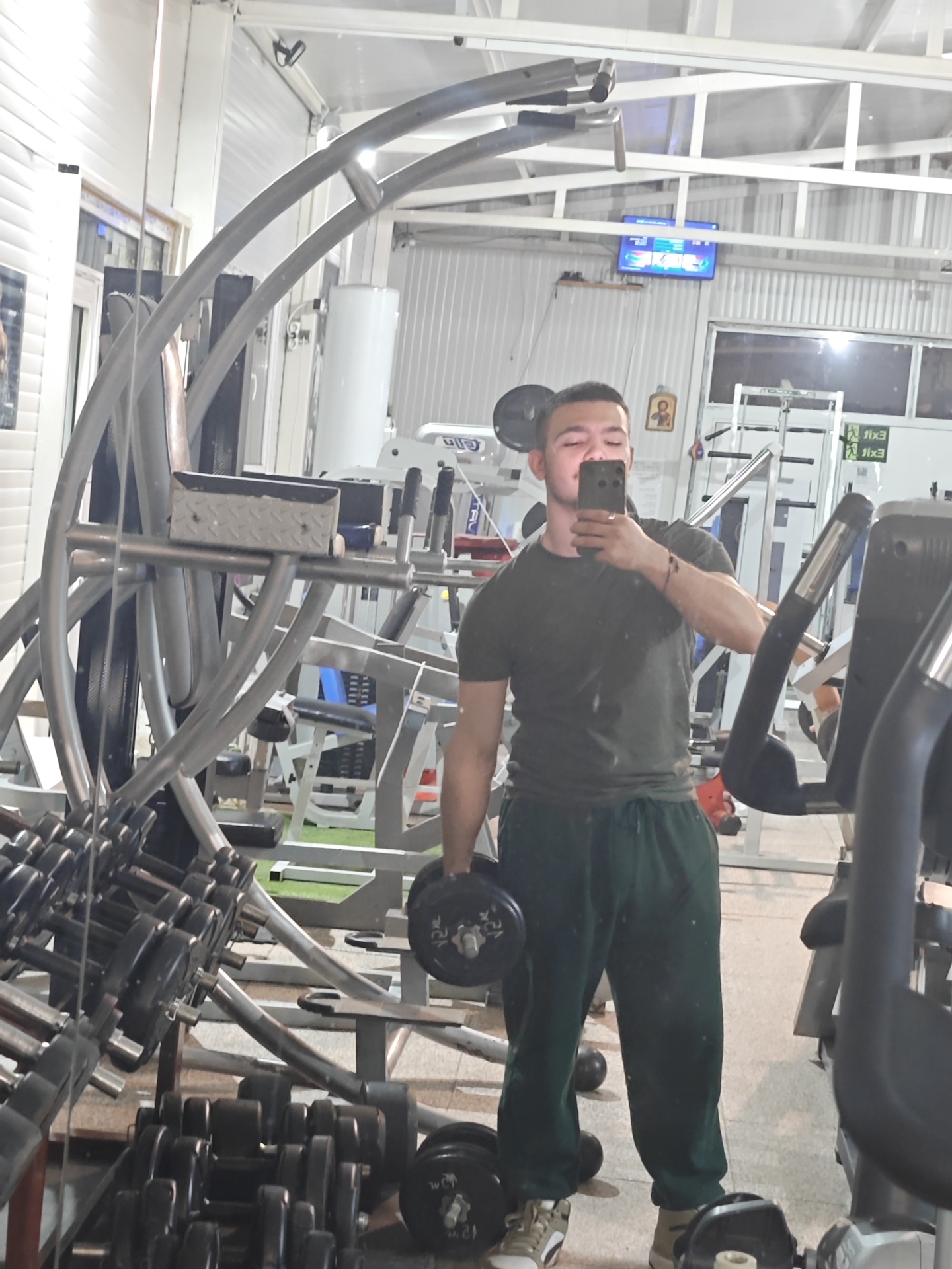 A man is taking a mirror selfie in a gym. He is holding a dumbbell in his right hand. He is wearing a dark green t-shirt and dark green sweatpants. The gym has various weightlifting equipment, including dumbbells and weight machines. The gym is likely located in Gulyantsi, Bulgaria, based on the prompt.