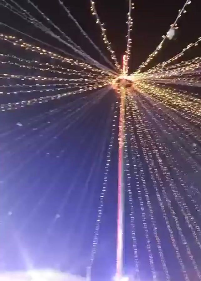 night scene with numerous strings of lights radiating outwards from a central pole or point. The lights are small and appear to be a warm white or golden color. At the bottom of the frame, there are bright lights, possibly stage lights or spotlights, shining upwards, casting a blue hue in the air. The overall environment seems festive, possibly at an outdoor event. There are faint figures of people visible at the very bottom of the frame. The camera moves, causing the lights to blur slightly.