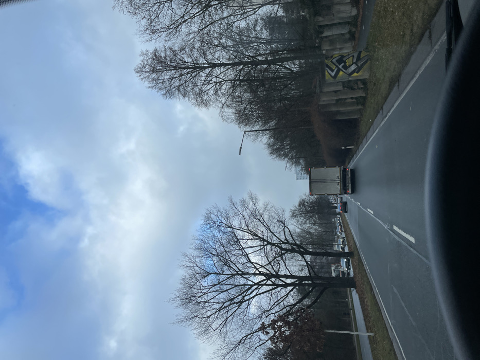 The image depicts a vehicle's forward view on a wet asphalt road in Nuremberg, Germany, specifically on a section of the Frankenschnellweg (A73) or Münchener Straße near the Dutzendteich area. The lower portion of a black steering wheel is visible at the bottom of the frame. The road consists of at least two lanes, with a single white dashed line separating the direction of travel. A white semi-trailer truck is directly ahead, driving in the same direction. Further ahead, a line of multiple vehicles is visible in both directions, indicating traffic. To the left of the road, a wide, paved median or shoulder separates the driving lanes from a parallel area dominated by numerous bare deciduous trees, indicative of late autumn or winter. In the far distance on the left, more structures and vehicles are partially visible. To the right of the road, a narrow grass verge runs alongside the asphalt, followed by a low, dark hedge. Beyond the hedge, a series of dark grey concrete pillars are arranged linearly, supporting a higher embankment or structure. The leftmost visible concrete pillar features prominent yellow and black graffiti in a geometric pattern. Behind these pillars, a dense line of bare deciduous trees forms a wooded area. A single dark grey street light pole extends upwards from this side. A tall, multi-story building is faintly visible in the far distance, rising above the treeline. The sky above is overcast with a mix of light grey clouds and patches of bright blue visible through breaks in the cloud cover. The overall lighting suggests a daytime scene with diffused light. No people are discernible in the frame.
