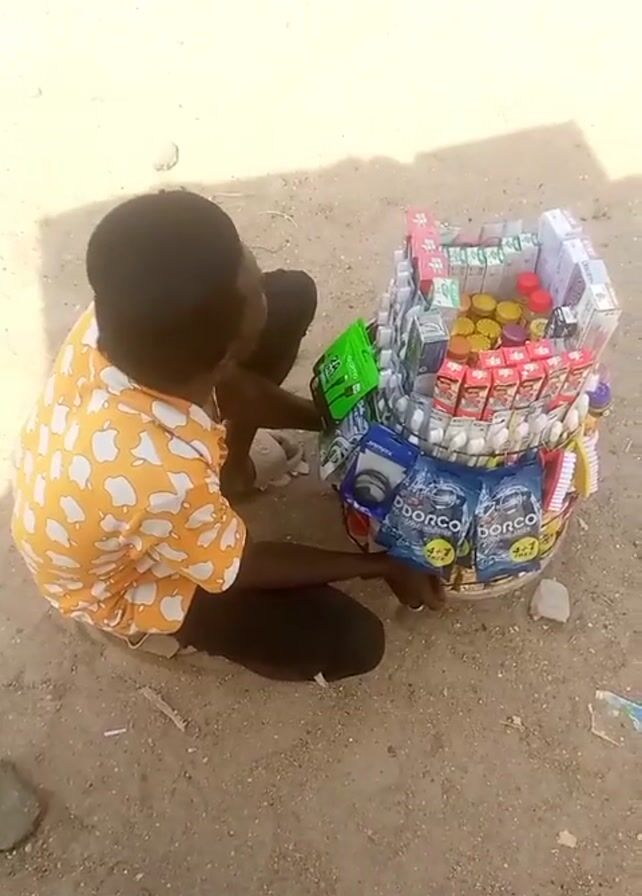 A young person is sitting on the ground, arranging items in a multi-tiered basket. The individual is wearing a short-sleeved, yellow shirt with a white apple pattern and black pants, along with a pair of brown sandals. The basket contains a variety of goods, including packets labeled "bonco," boxes of toothpaste, bottles of pills, and other small items. The setting appears to be an outdoor dirt or gravel area, with pieces of brick or other materials scattered on the ground. The person is focused on the task of organizing the items within the basket.