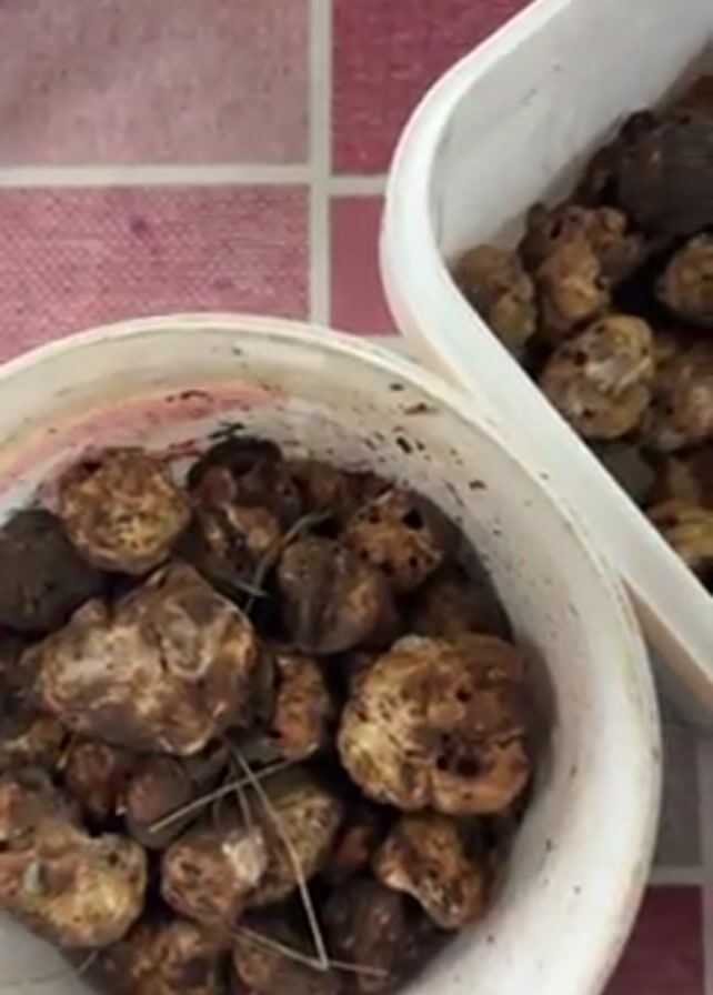 two white plastic containers filled with truffles. One container is round and the other is rectangular. The truffles are brown and irregularly shaped, with some dirt clinging to them. The containers are sitting on a pink and white checkered surface. The camera angle alternates to show a close-up of each container.