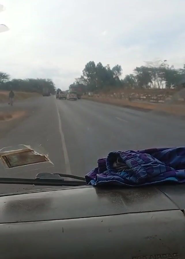 The video depicts a view from inside the cab of a vehicle, likely a truck, traveling on a paved road