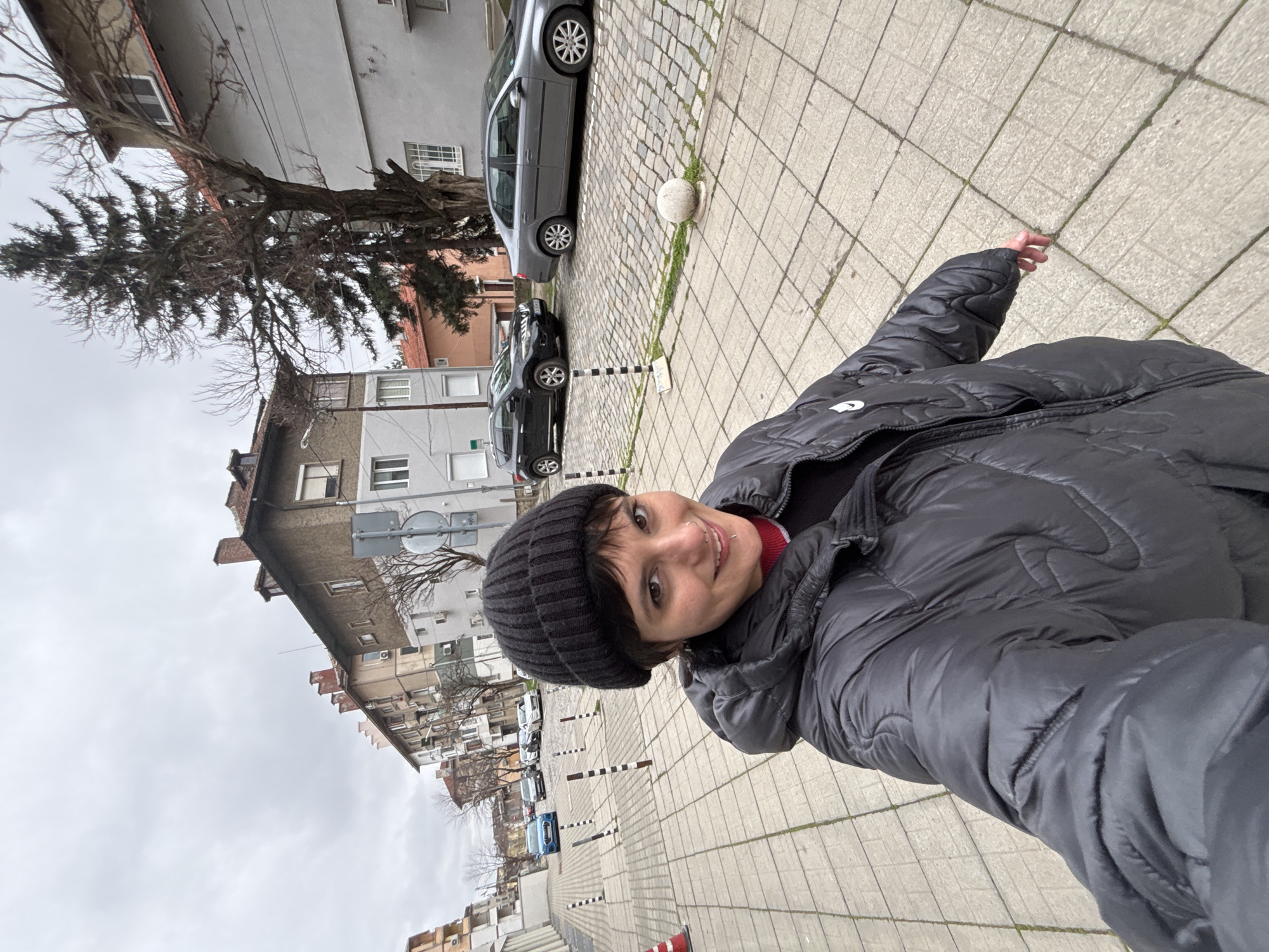A street in Sofia, Bulgaria is depicted in this selfie-style shot. A person wearing a black winter coat and a black beanie is standing on a paved sidewalk composed of large, square tiles. Buildings of varying heights line the street, exhibiting diverse architectural styles and colors. Several cars are parked alongside the sidewalk, and trees with bare branches are visible. The sky is overcast. Black and white striped bollards line the sidewalk, and a red and white cone is visible in the lower portion of the image.