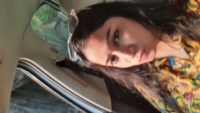 A female individual is depicted in a close-up portrait, seated within an automobile interior in New Town, India. She has long, dark, wavy hair, with clear-framed sunglasses featuring dark lenses positioned atop her head. Her face, partially illuminated by direct sunlight from the left, displays dark eyes and slightly pursed lips, directed towards the camera. She wears a yellow collared garment adorned with a vibrant, multi-colored print and prominent metallic buttons. The visible car interior features light-colored trim, including an A-pillar or door frame on the left and a headliner. Green foliage is discernible through a vehicle window in the upper right background, indicating an external natural environment.
