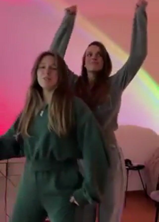 Two young women are dancing in a room with a rainbow light display projected on the wall behind them. One woman is wearing a green sweatsuit and the other is wearing a gray sweatshirt and light blue jeans. They are both facing the camera while they dance, but turn around at one point in the video. Both women have their arms raised above their heads at various points. In the background is a keyboard, a stool, and a white fur throw pillow.