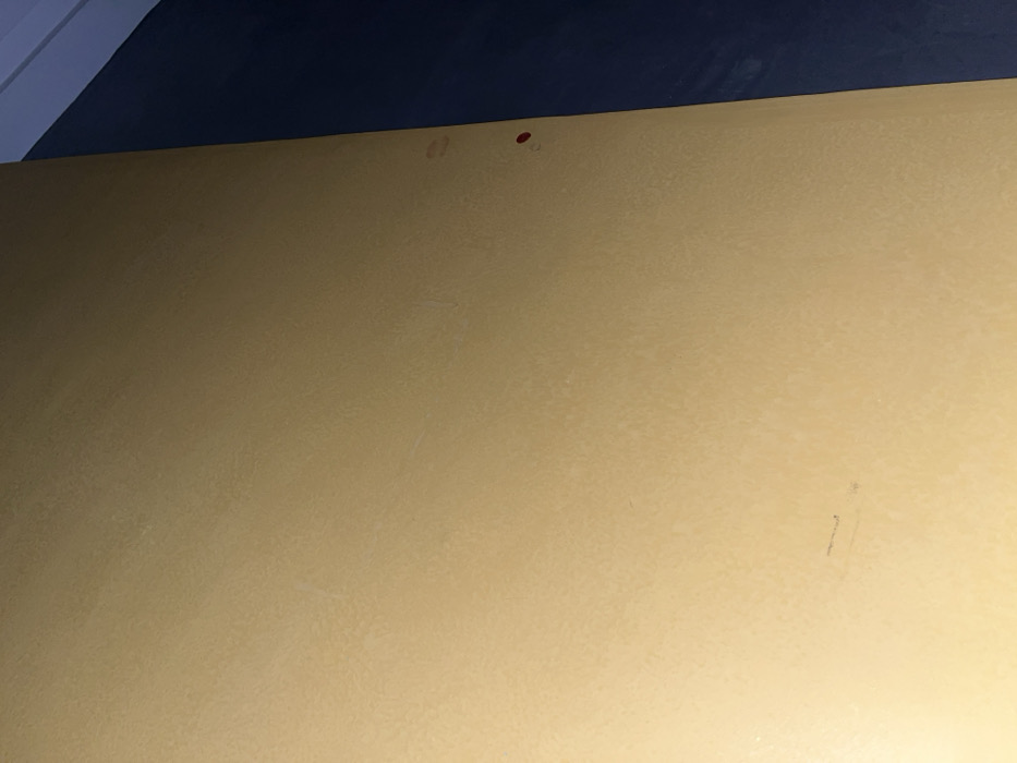 A mostly yellow wall with a slightly textured surface is featured. At the top, a dark blue area suggests a ceiling. There are a couple of darker spots along the top edge, including one small red dot. A short, dark scratch or mark is present near the lower right. A small section of white or light gray appears in the top left corner.