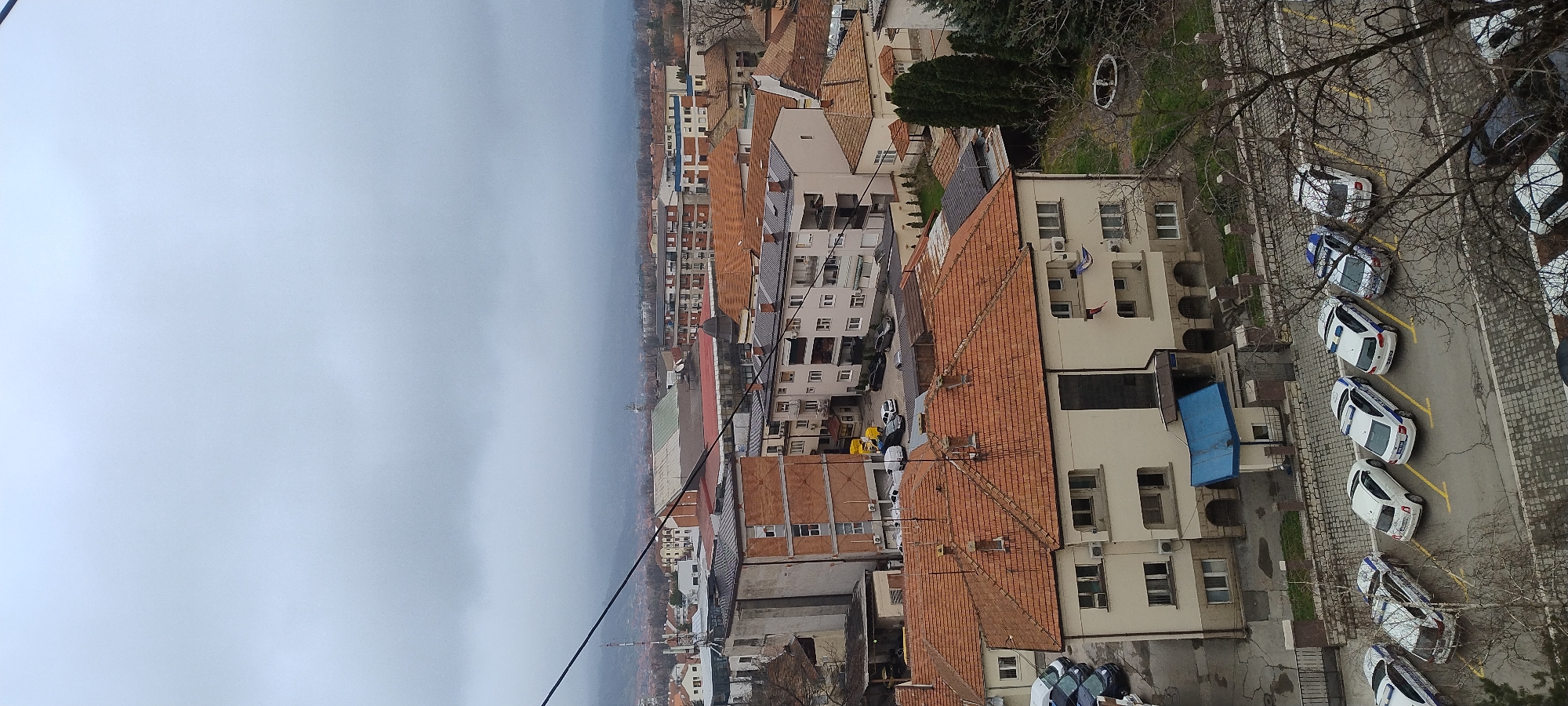 n aerial view of an urban landscape on an overcast day. The location is presumed to be a city in an unknown area. In the foreground and center, buildings with red-tiled roofs dominate the immediate scene, transitioning into denser blocks of similar architecture in the midground. Several multistory buildings of white and gray, possibly residential or commercial properties, are evident. A line of parked vehicles, identifiable as police cars due to their white and blue color schemes, are positioned adjacent to a building with visible air conditioning units and flag poles. The presence of these vehicles suggests a police station or a related law enforcement facility in the vicinity. The background landscape fades into a hazy or foggy horizon, obscuring details of distant buildings and geographical features. A tall tower-like structure is barely visible in the distance, likely a prominent landmark or communication tower. Bare branches of trees extend from the top right, adding a textural element to the aerial perspective.