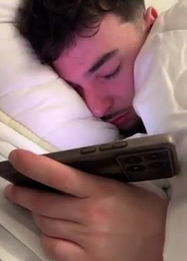 A man lies in bed, mostly covered by a white comforter, with his head resting on a white pillow. His eyes are closed. He holds a cell phone in his hand, and its screen displays a video. The man appears to be asleep while watching the video on his phone. The phone is dark gray and has several rear cameras. The video playing on the phone features two people in what appears to be a YouTube video.