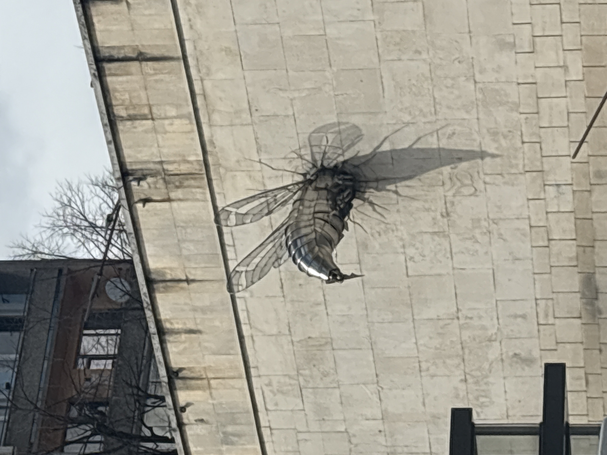 An outdoor scene in Gabrovo, Bulgaria, features a large, metallic insect sculpture mounted on a light-colored, rectangular tiled wall. The sculpture, resembling a fly or bee, is constructed from segmented, polished silver-toned metal, featuring detailed, transparent-appearing wings with visible venation, and multiple slender, wire-like legs that connect it to the wall surface. A prominent shadow of the sculpture is cast downwards and to its right. Above the wall, the upper section of a dark, multi-story building is visible, characterized by rectangular windows, reflections, and a distinctive circular window on one level. Bare tree branches are silhouetted against the building and an overcast, light grey sky. A dark, geometric structure is partially visible in the lower left foreground. No individuals are present in the depicted scene.