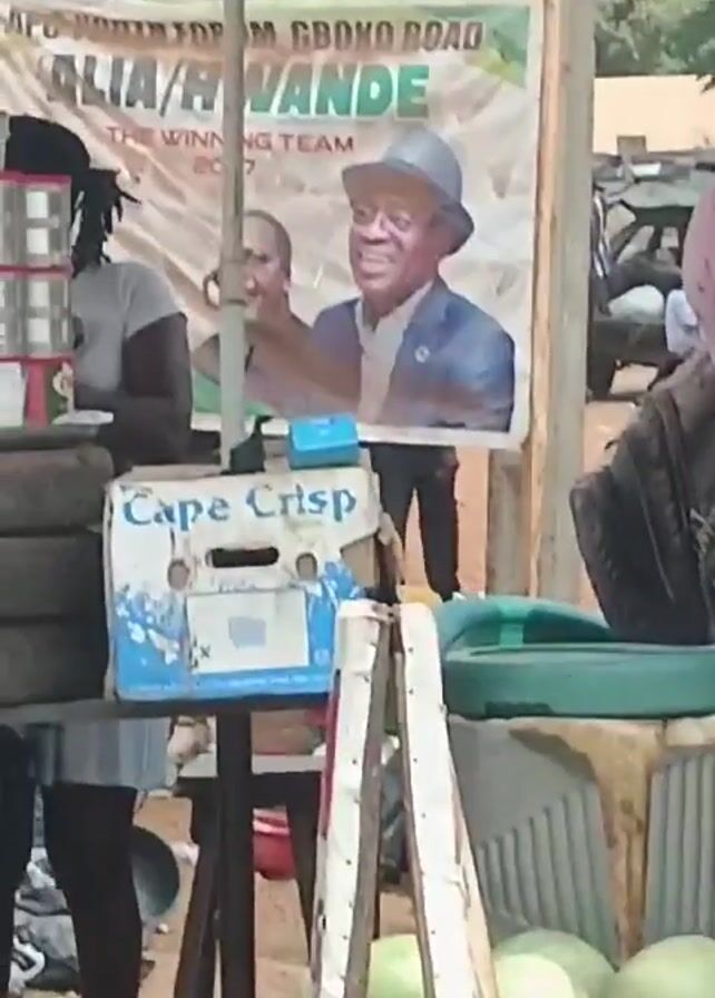 n outdoor marketplace scene. At the beginning of the video, three green watermelons rest on a wooden surface beside a beverage container and a wooden stool. As the camera pans up, a person with dark hair and a white shirt stands behind a makeshift table. The table is constructed with tires. Canned goods are stacked on the tires. A white box with the words "Cape Crisp" is also on the table. A political banner is in the background with two men's pictures and text, "ALIA/GWANDE" "THE WINNING TEAM 2027". A man in a white shirt walks in front of the table. A yellow auto-rickshaw is partially visible behind the table.
