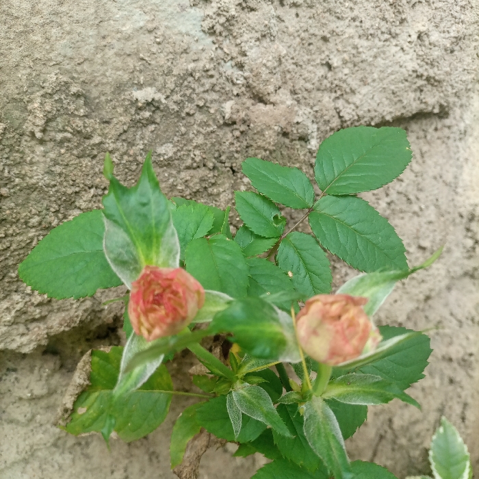 The scene depicts a close-up view of a small plant with two rosebuds, situated in the city of Kimorori/Wempa ward, Kenya. The plant occupies the foreground and midground, growing against a textured backdrop. Two distinct rosebuds are visible in an early stage of development; the primary bud, positioned in the lower-left to central frame, displays a reddish-orange hue with lighter, possibly yellowish-cream patches, tightly enclosed by green sepals and nascent, light green leaves, some exhibiting fine, white pilosity. A second, similar rosebud is partially visible and slightly out of focus in the lower-right quadrant. The plant's foliage consists of multiple dark to medium green, compound leaves, characteristic of a rose species, some showing minor surface irregularities. The background's upper portion features a rough, unevenly textured concrete or stucco wall, exhibiting variations in light brown and beige tones. The lower background comprises lighter, sandy-colored soil or dirt directly beneath the plant. No individuals, animals, or observable actions are present within the frame.