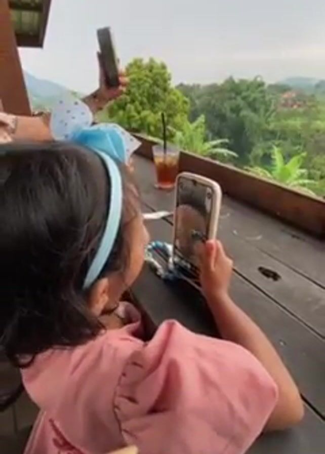 young girl sitting at a wooden table, engaged in a video call on a smartphone. She is wearing a pink top and a light blue headband. The phone is positioned to show both her and the person on the other end of the video call. In the background, there's a view of lush greenery with trees and possibly distant houses. There's also a glass of iced tea on the table and another person can be seen in the background holding up another phone, potentially taking a photo or video. The little girl turns and smiles towards the camera.
