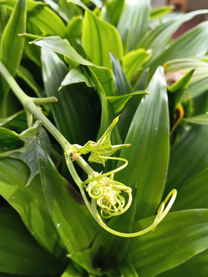 Lush green foliage dominates the view, featuring broad, pointed leaves. A slender, winding tendril with curled ends and small leaves emerges, climbing against the foliage. The tendril’s pale green color contrasts slightly with the deeper green leaves behind it. The composition focuses on the interplay between the textures and shapes of the two plant types.