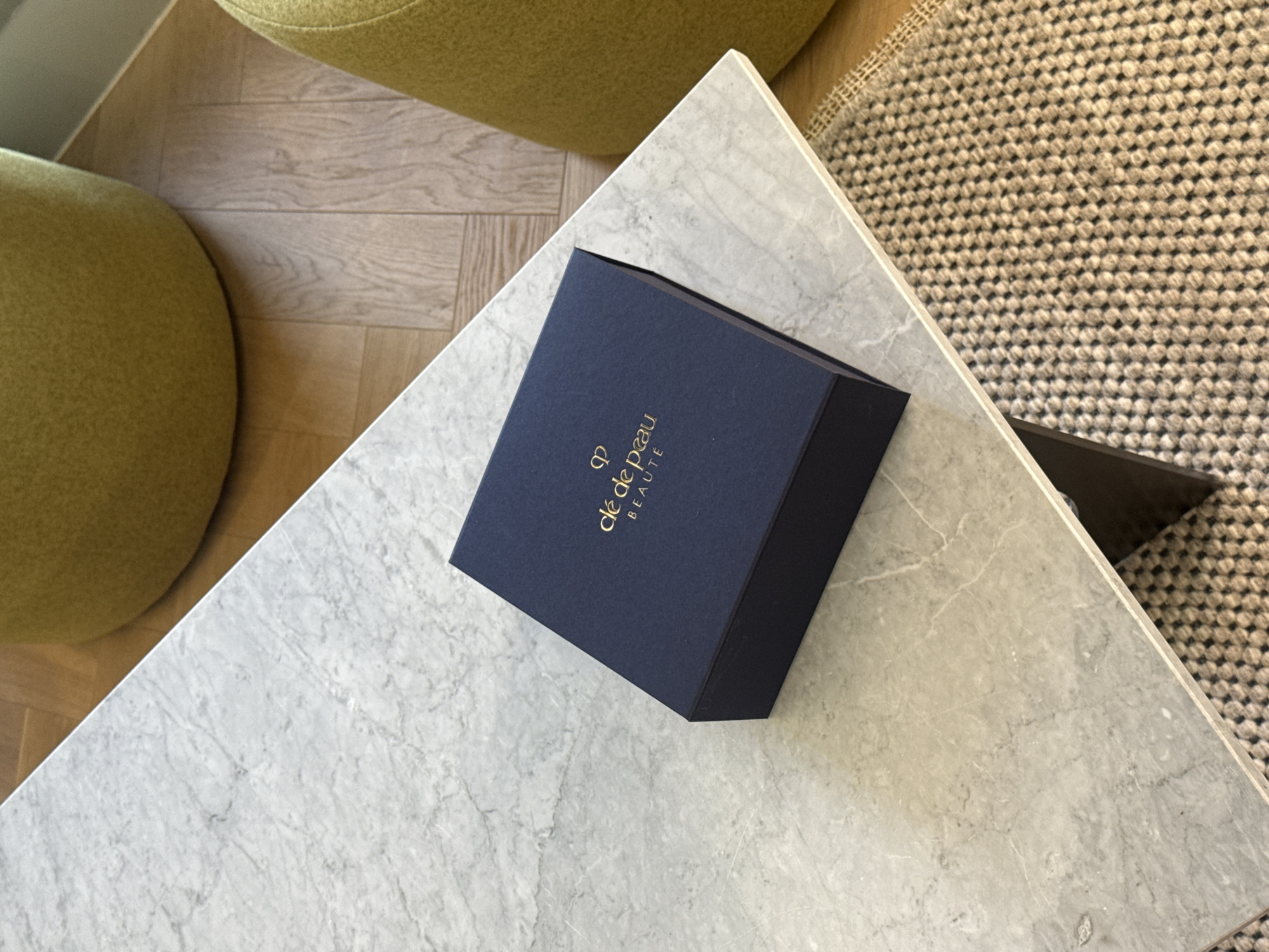 A dark blue rectangular box, embossed with the gold "clé de peau BEAUTÉ" logo and text, is centered on a light grey marble table. The marble surface displays natural veining. The table diagonally bisects the lower right corner, revealing a tightly woven beige rug with a repeating square pattern on a light wooden floor. In the upper right, two out-of-focus, rounded furniture pieces, upholstered in a textured chartreuse fabric, are partially visible. No individuals or specific actions are present. The precise location within London, United Kingdom, is not identifiable from the scene.