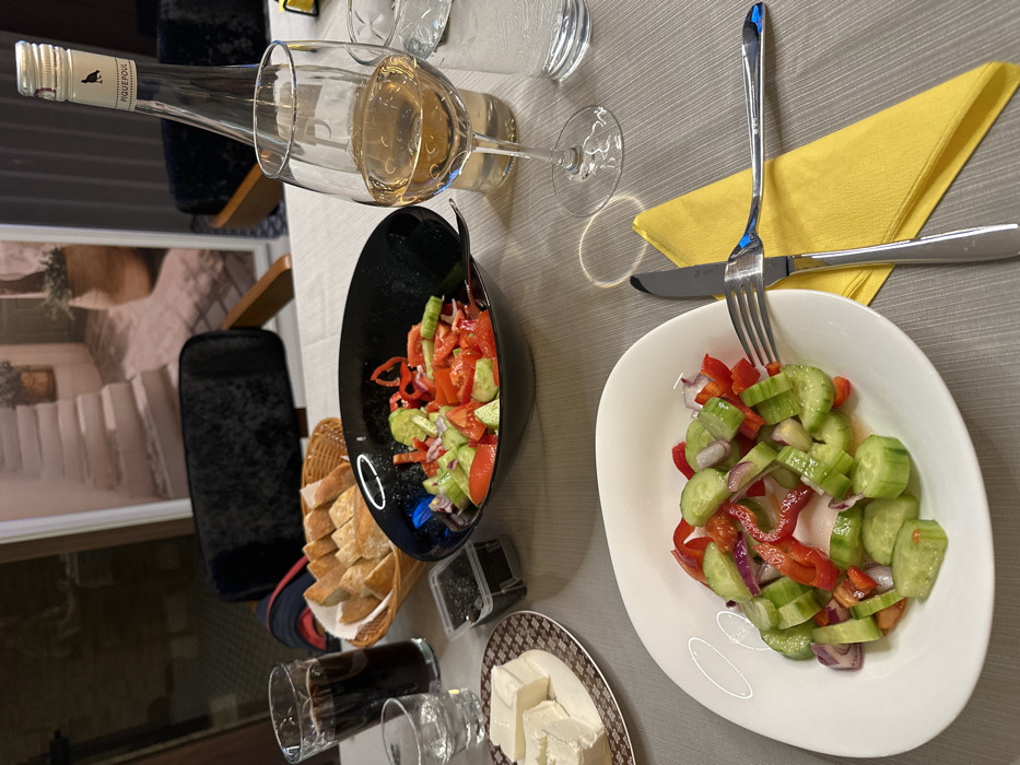 An indoor dining scene is depicted on a grey tablecloth in Bozhichen, Bulgaria. In the foreground, a white, curvilinear plate holds a salad composed of diced cucumbers, red bell peppers, and red onions. A silver fork and knife rest on a folded yellow napkin beside this plate. To the left, a patterned plate contains several rectangular blocks of white cheese. Above this, a small, square, black container holds a dark, granular substance, possibly black olives or caviar. A tall glass with a dark beverage and a smaller glass with clear liquid are positioned next to a wicker basket filled with sliced bread. Centrally, a black bowl contains a larger portion of the same salad, featuring diced cucumbers, red bell peppers, and red onions. To the right, a clear wine bottle labeled "PIQUEPOUL" stands beside a wine glass partially filled with rosé wine. A clear water glass is also present. The background features a framed picture of a stone staircase in an outdoor setting and a dark, plush chair. No individuals are present in the image.